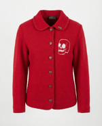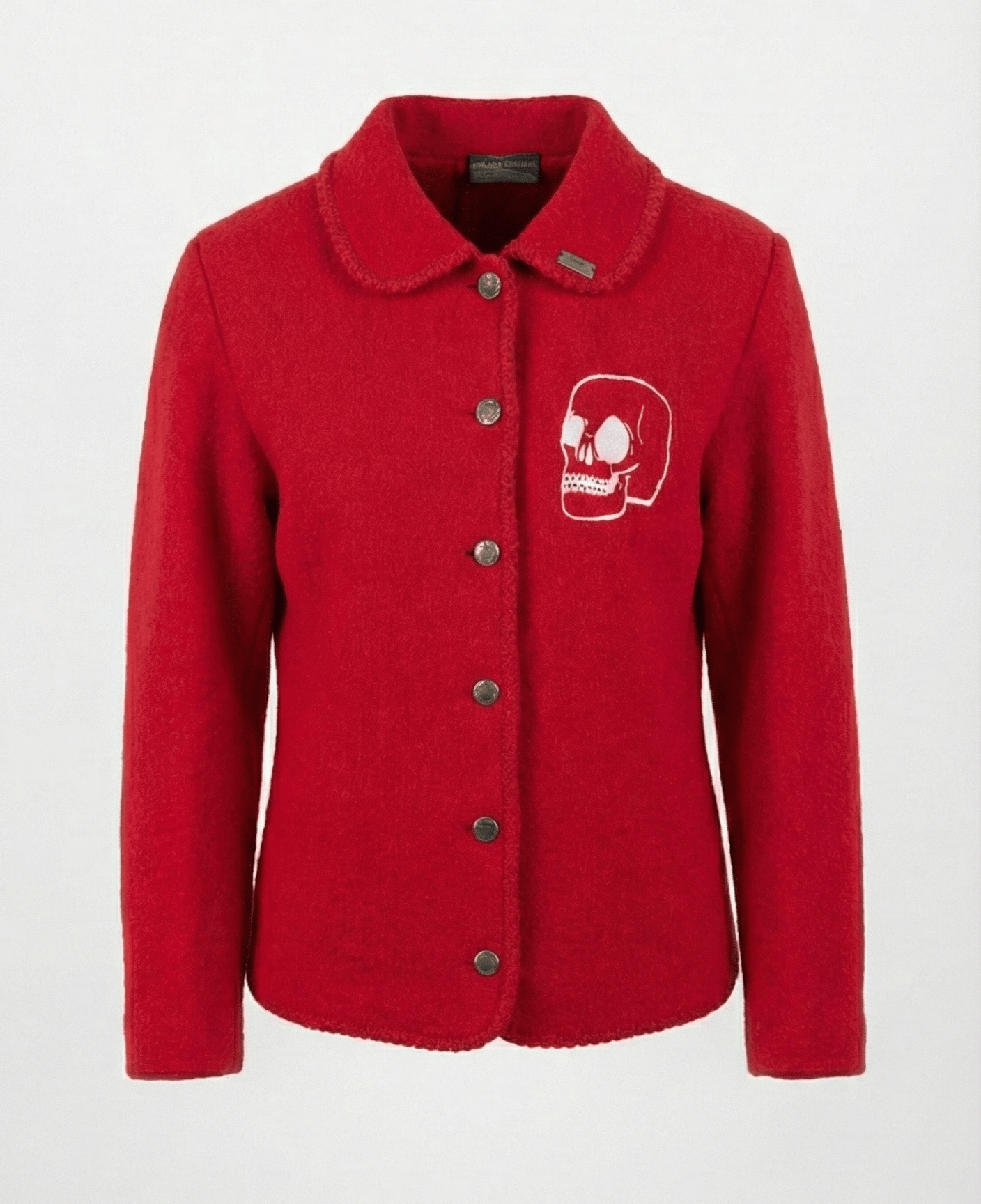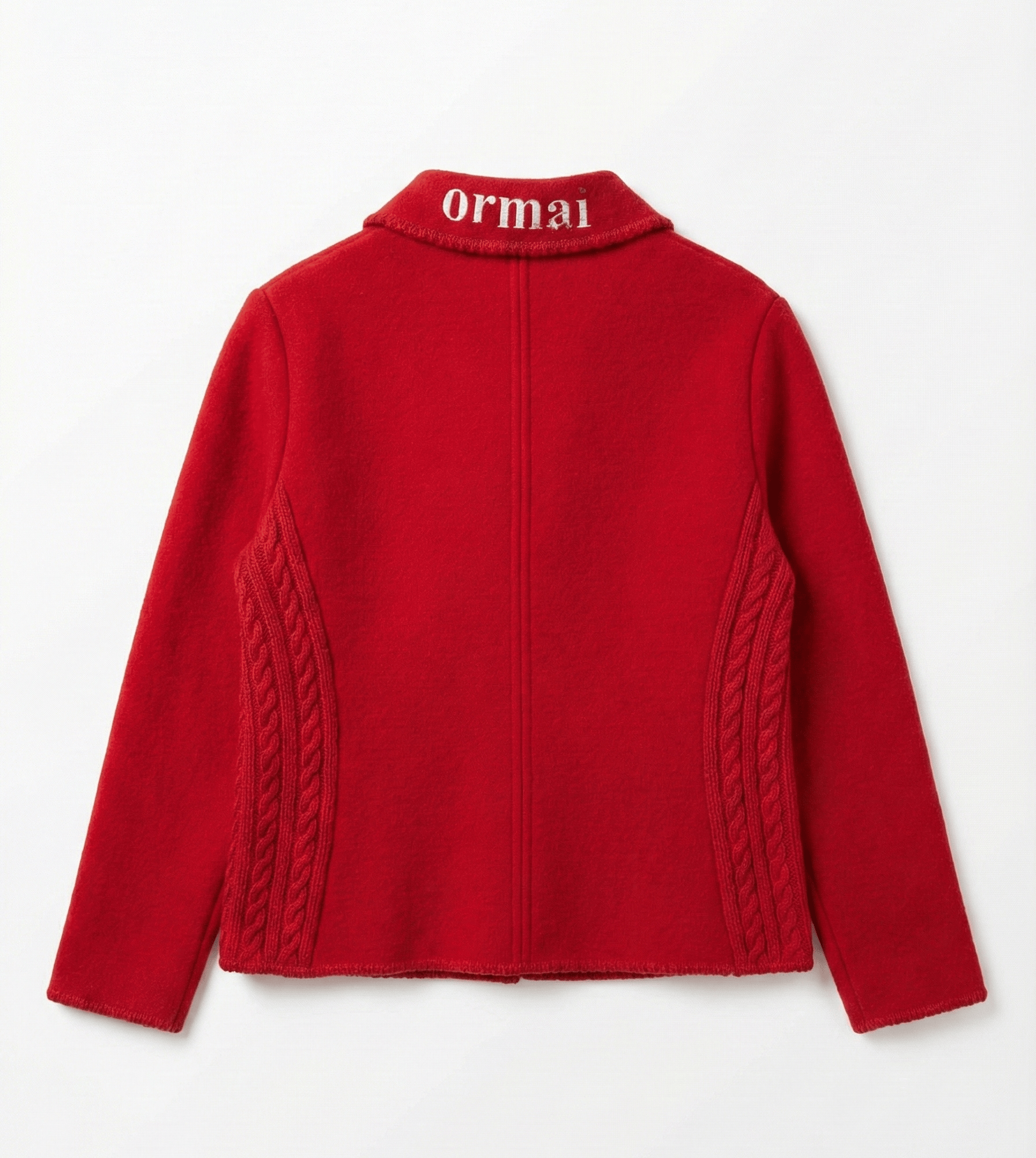 Giacca in pura lana vergine, ricamo lato cuore frontale, stampa serigrafica DTF retro colletto.
